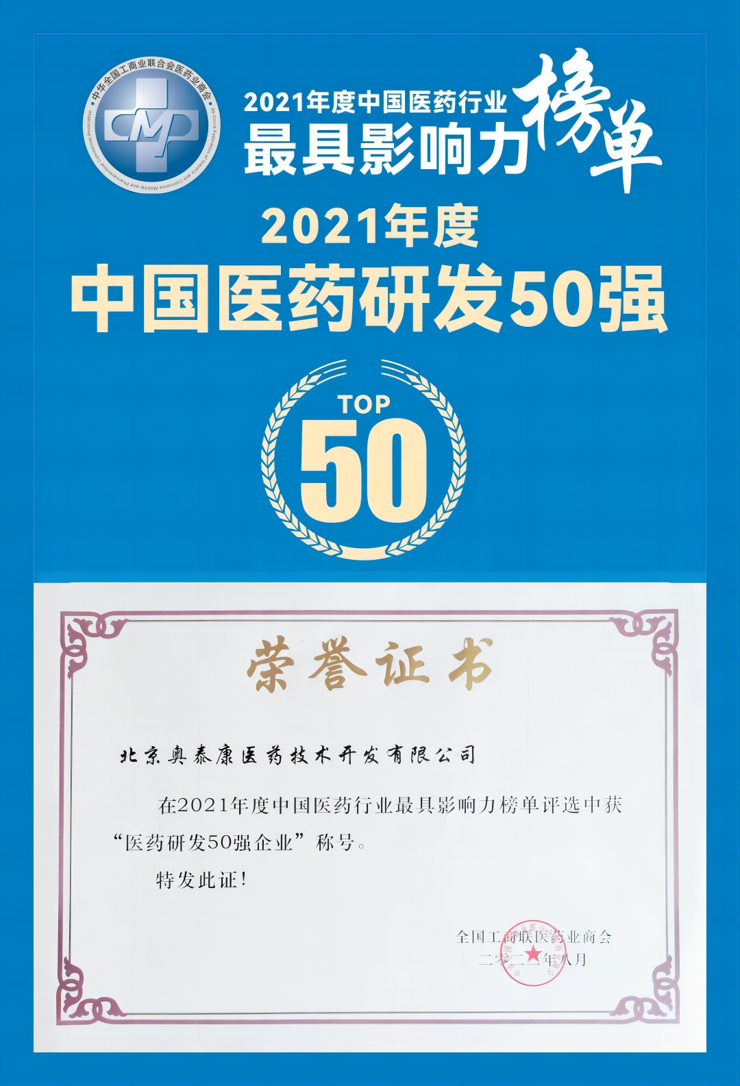 2023年3月25日-27日,全國工商聯(lián)醫(yī)藥業(yè)商會年度峰會于青島隆重舉行,大會公布了“2021年度中國醫(yī)藥行業(yè)最具影響力榜單”,奧泰康在本次評選中入圍中國醫(yī)藥研發(fā)50強榜單。