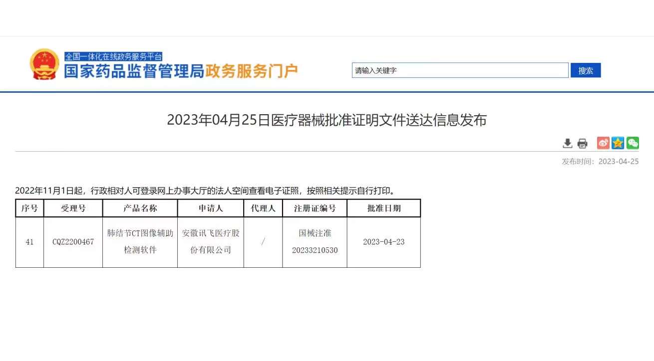 2023年4月25日,經(jīng)國家藥品監(jiān)督管理局公示,安徽訊飛醫(yī)療股份有限公司的“肺結(jié)節(jié)CT圖像輔助檢測軟件”(國械注準20233210530)獲得NMPA批準上市,奧泰康承擔本項目臨床試驗服務,系2023年奧泰康助力獲得的第7張三類醫(yī)療器械注冊證,也是公司累計助力獲得的第12張人工智能(AI)醫(yī)療器械注冊證。