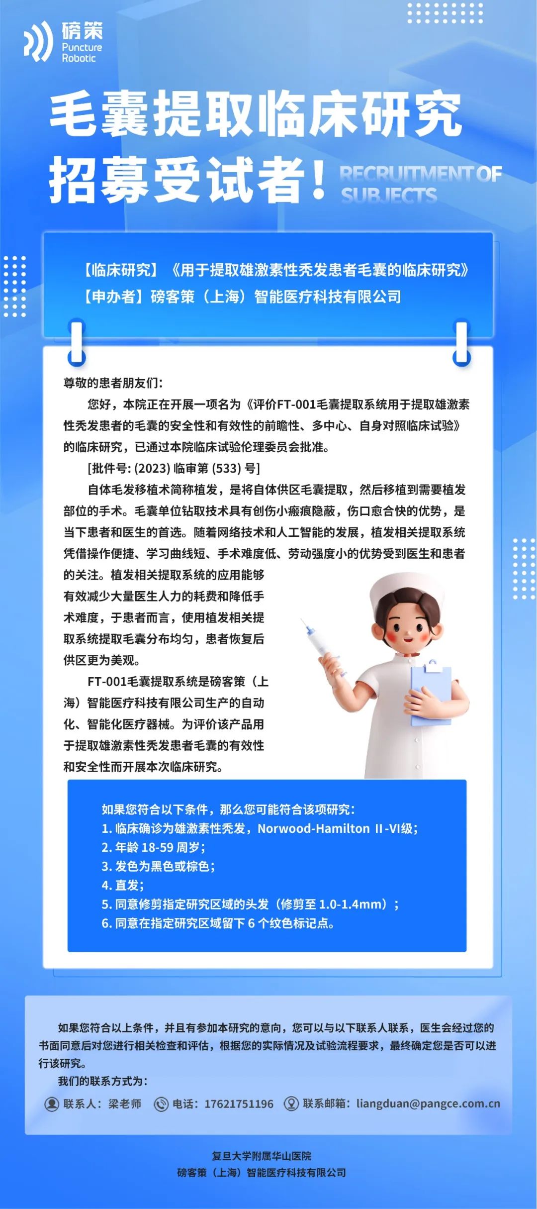 近期,由磅客策 (上海)智能醫(yī)療科技有限公司研發(fā)的磅策植發(fā)機(jī)器人在上海成功召開臨床試驗(yàn)啟動(dòng)會(huì)暨人工智能毛發(fā)創(chuàng)新中心落成典禮,奧泰康負(fù)責(zé)臨床試驗(yàn)服務(wù)。