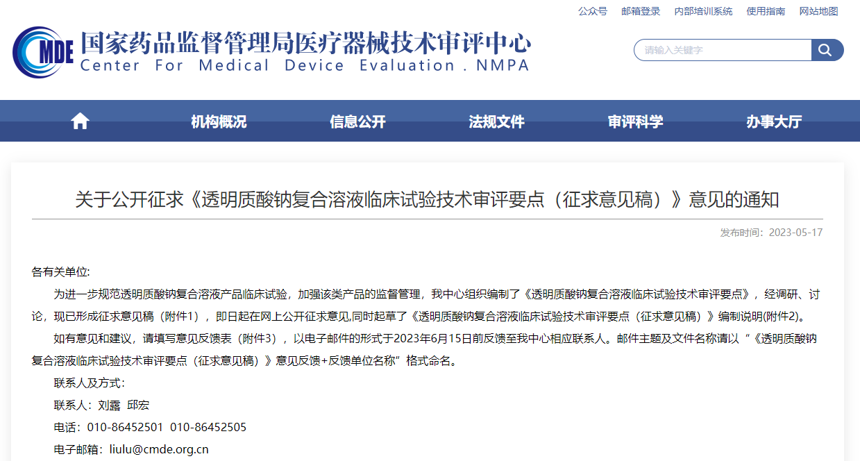 ▲ 《透明質(zhì)酸鈉復(fù)合溶液臨床試驗技術(shù)審評要點(diǎn)(征求意見稿)》 (來源:器審中心)