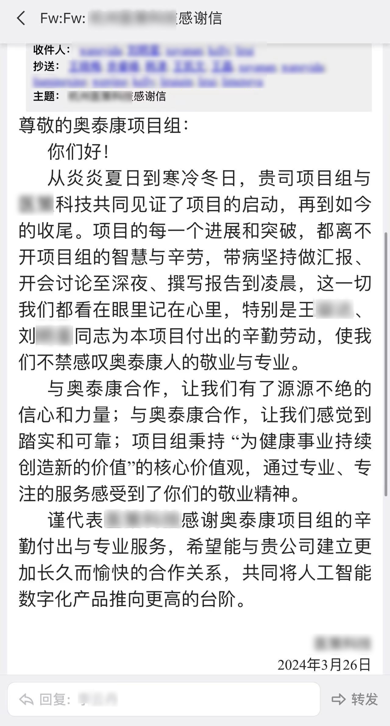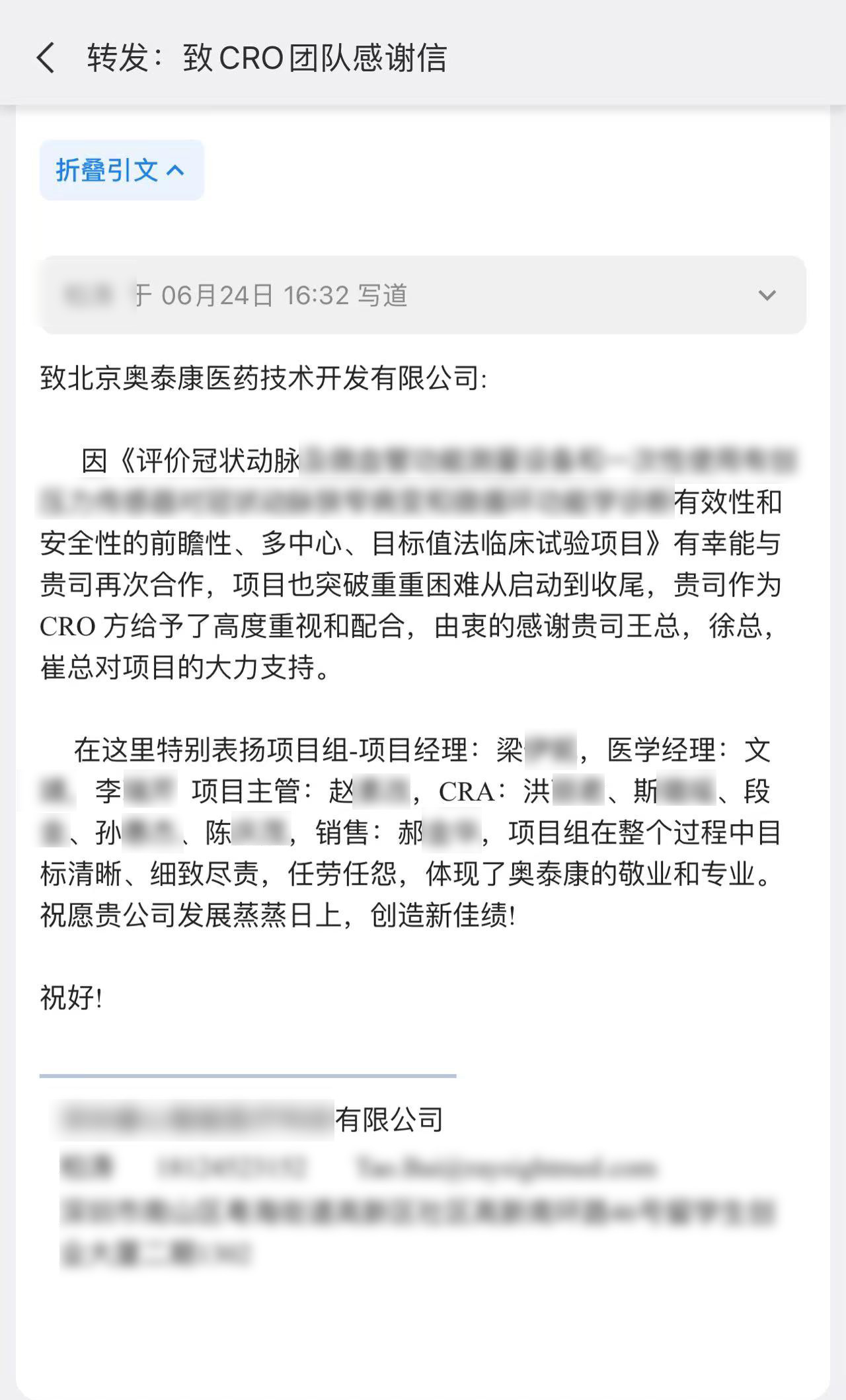 每一個項(xiàng)目的推進(jìn)離不開臨床團(tuán)隊的共同努力,一年過半,奧泰康陸續(xù)收到了多封來自合作伙伴的感謝信和表揚(yáng)信,信中對奧泰康人在臨床試驗(yàn)項(xiàng)目中的表現(xiàn)給予高度肯定。我們也對他們致以由衷的敬意,感謝他們?yōu)橥七M(jìn)產(chǎn)品上市付出的不懈努力,讓我們共同查收這些信件吧~