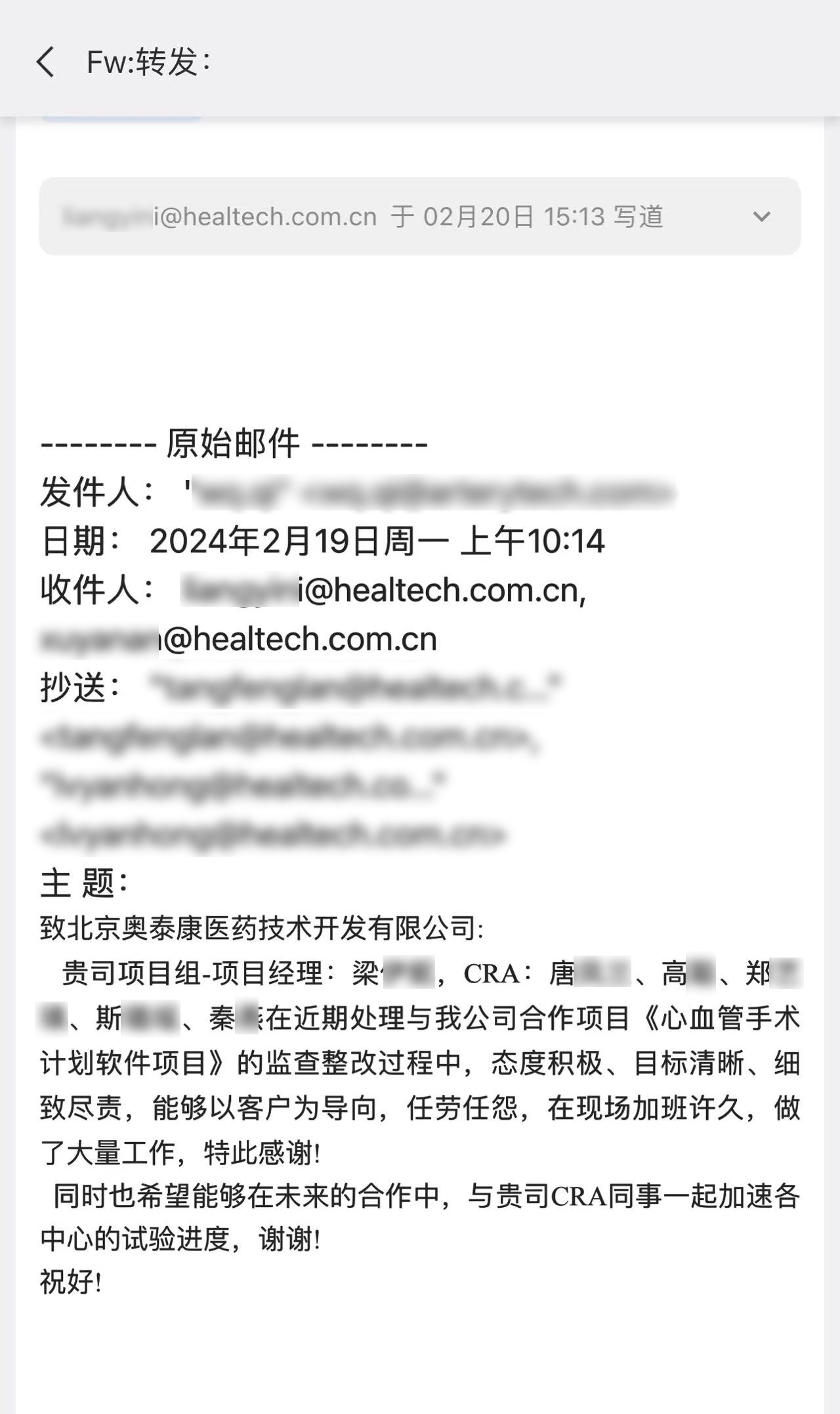 臨床資訊速遞實(shí)力點(diǎn)贊 ——來自臨床的感謝信&表揚(yáng)信?? 一起查收吧~臨床試驗(yàn) 作為人類追求生命健康過程中的重要一環(huán),照亮著醫(yī)學(xué)前行的道路,新藥和醫(yī)療器械通過臨床試驗(yàn),經(jīng)過科學(xué)的研究驗(yàn)證其安全性和有效性之后,獲得批準(zhǔn)上市的資格,為臨床患者帶來健康和希望。是每一位參與臨床試驗(yàn)的受試者、研究者、合作伙伴和醫(yī)療從業(yè)者共同的努力,使中國臨床試驗(yàn)事業(yè)不斷向更高的臺階邁進(jìn)。