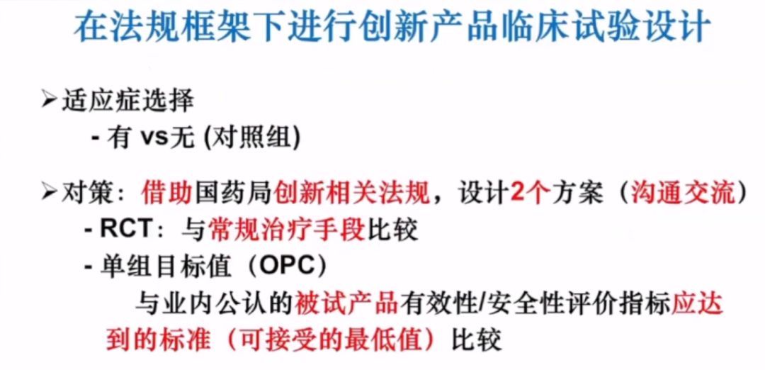 在法規(guī)框架下進(jìn)行創(chuàng)新產(chǎn)品的臨床試驗(yàn)設(shè)計(jì),李教授認(rèn)為最關(guān)鍵的是適應(yīng)癥的選擇問(wèn)題(有無(wú)對(duì)照組),可設(shè)計(jì)出2個(gè)方案,以便和國(guó)家藥監(jiān)局相關(guān)部門(mén)溝通。