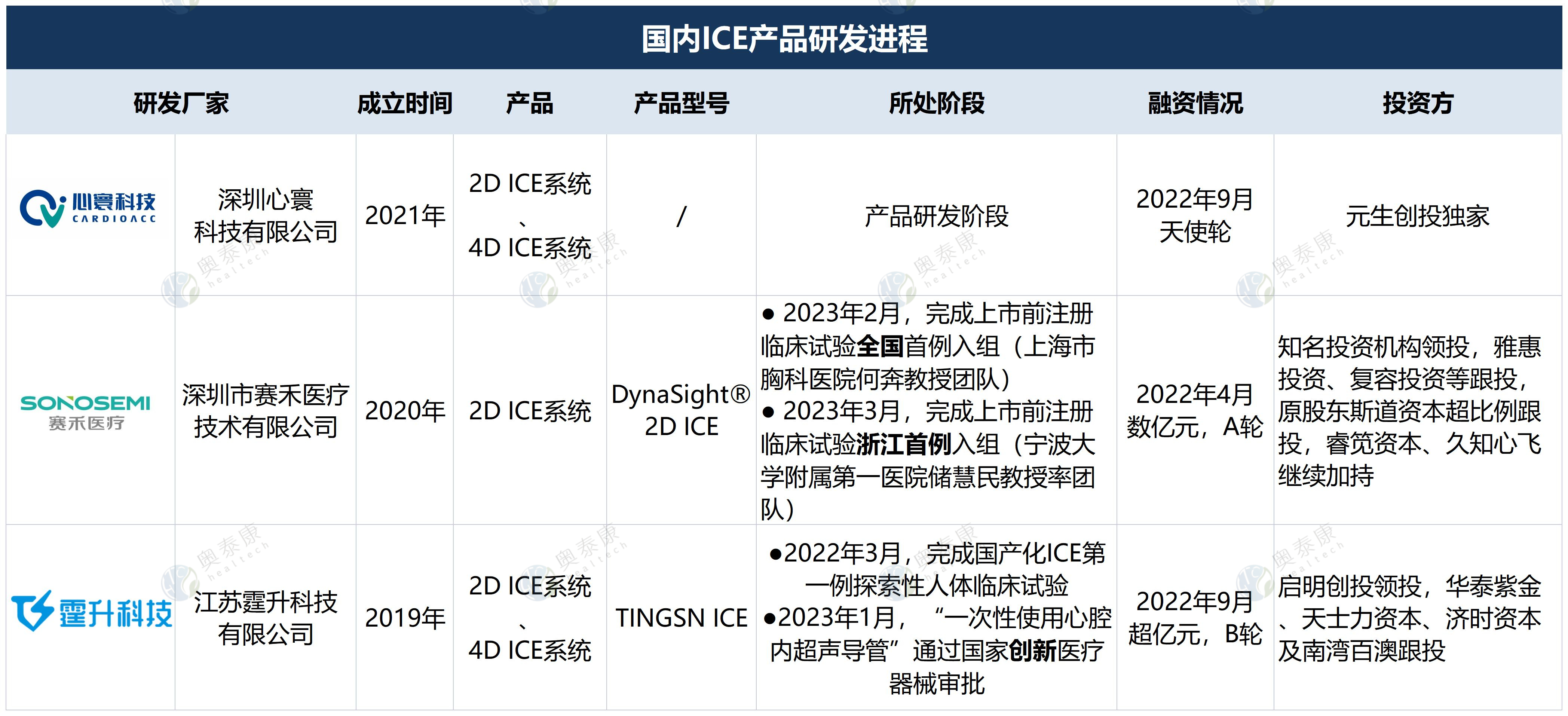全球ICE市場中,歐美企業(yè)占主要份額,強(qiáng)生、雅培、西門子、飛利浦、GE醫(yī)療、波士頓科學(xué)等均已布局,而國內(nèi)ICE起步較晚,仍處發(fā)展初期,相關(guān)產(chǎn)品和市場滲透率較低,企業(yè)具有較大的發(fā)展空間,國內(nèi)研發(fā)廠商有塞禾醫(yī)療、心寰科技、霆升科技、澤樸醫(yī)療、歡影醫(yī)療等。隨著ICE在臨床應(yīng)用優(yōu)勢的凸顯,ICE賽道逐漸升溫并獲得資本青睞,國內(nèi)部分ICE廠家已在2022年完成新一輪融資。