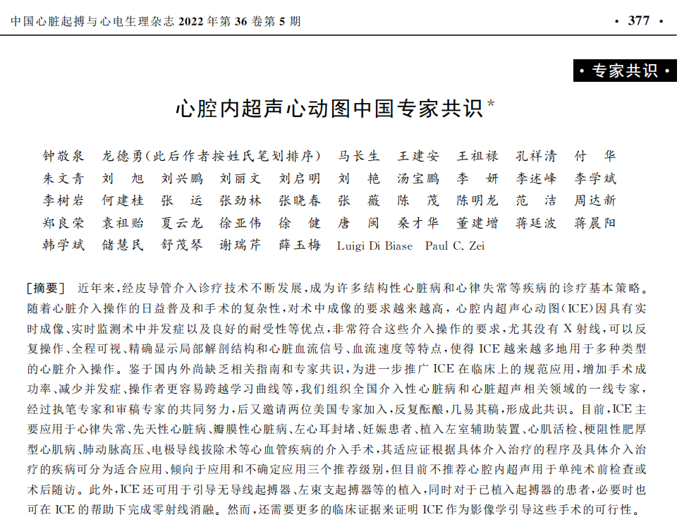 鑒于目前國(guó)際上缺乏相關(guān)指南,為促進(jìn)和規(guī)范ICE的臨床應(yīng)用,為臨床醫(yī)生提供指導(dǎo),進(jìn)一步完善心血管介入診斷和治療方案,2022年10月,由國(guó)內(nèi)外數(shù)十位頂尖專(zhuān)家學(xué)者編寫(xiě)完成全球首個(gè)心腔內(nèi)超聲專(zhuān)家共識(shí),聯(lián)合在Frontiers in Cardiovascular Medicine上發(fā)表,推動(dòng)了心腔內(nèi)超聲心血管介入領(lǐng)域的的規(guī)范化應(yīng)用。