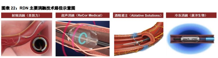 交感神經(jīng)過(guò)度興奮可使血壓上升,高血壓死亡風(fēng)險(xiǎn)高、治療負(fù)擔(dān)重,盡管已上市降壓藥物眾多,但仍存在大量藥物依從性差耐藥患者。經(jīng)腎動(dòng)脈去交感神經(jīng)術(shù)(RDN)是指通過(guò)介入治療方法(經(jīng)股動(dòng)脈、橈動(dòng)脈),破壞腎交感傳入和傳出神經(jīng),減弱腎和全身交感神經(jīng)活動(dòng),從而降低血壓,實(shí)現(xiàn)一次微創(chuàng)手術(shù)長(zhǎng)期平穩(wěn)降壓。RDN技術(shù)已經(jīng)歷10余年發(fā)展,可基于射頻消融、超聲消融、冷凍消融、化學(xué)消融等方式,其中主要以射頻消融(rRDN)和超聲消融(uRDN)為主導(dǎo)。