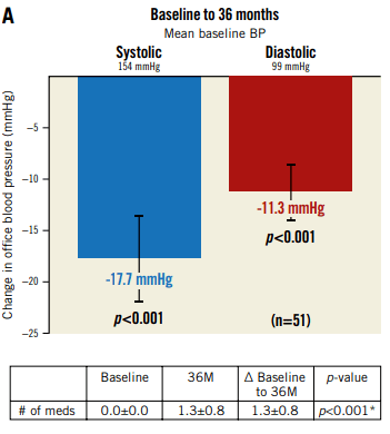 試驗(yàn)結(jié)果:36個(gè)月的隨訪資料顯示,當(dāng)兩組使用了治療強(qiáng)度相似的抗高血壓藥物時(shí),RDN組動(dòng)態(tài)收縮壓降幅顯著高于假手術(shù)組,RDN治療與Sham相對(duì)比,顯著降低患者血壓可達(dá)3年,且無(wú)安全性問(wèn)題,這一療法可作為高血壓患者藥物治療的替代方案。