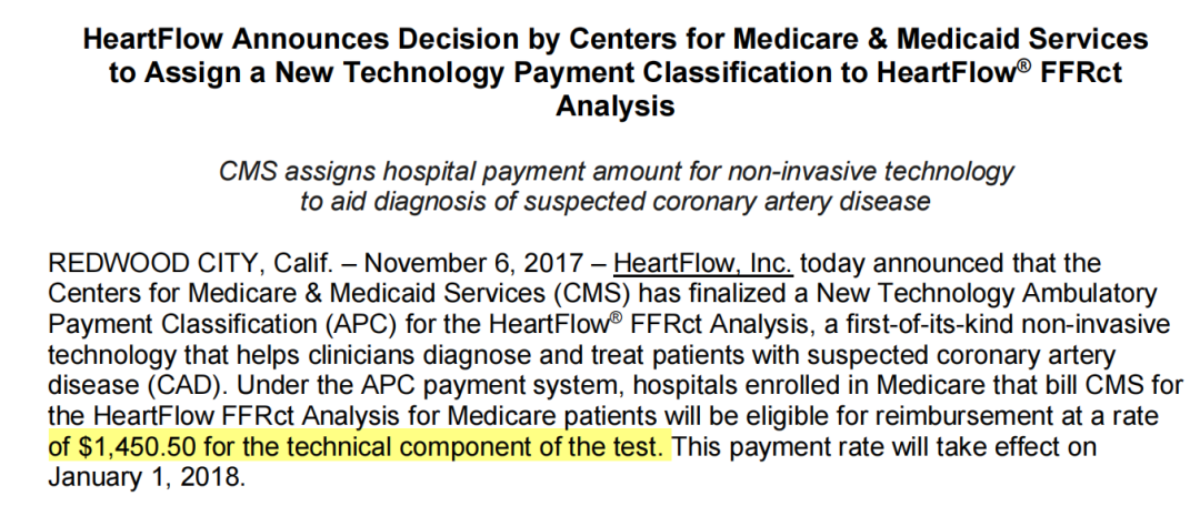 美國HeartFlow公司的FFRCT從2014年開始在歐美日韓等發(fā)達(dá)國家進(jìn)行了廣泛應(yīng)用,被寫入多個(gè)臨床指南,且多個(gè)保險(xiǎn)產(chǎn)品都可報(bào)銷相關(guān)的檢查費(fèi)用,從2018年1月1日起,美國醫(yī)保報(bào)銷金額為1450.5美元/例(圖3)。