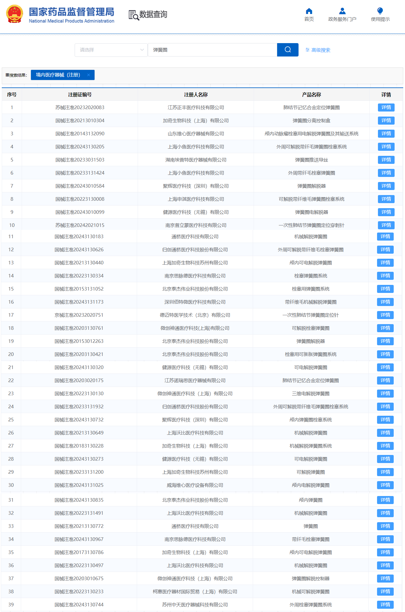 國內(nèi)已獲批的彈簧圈產(chǎn)品(含外周)