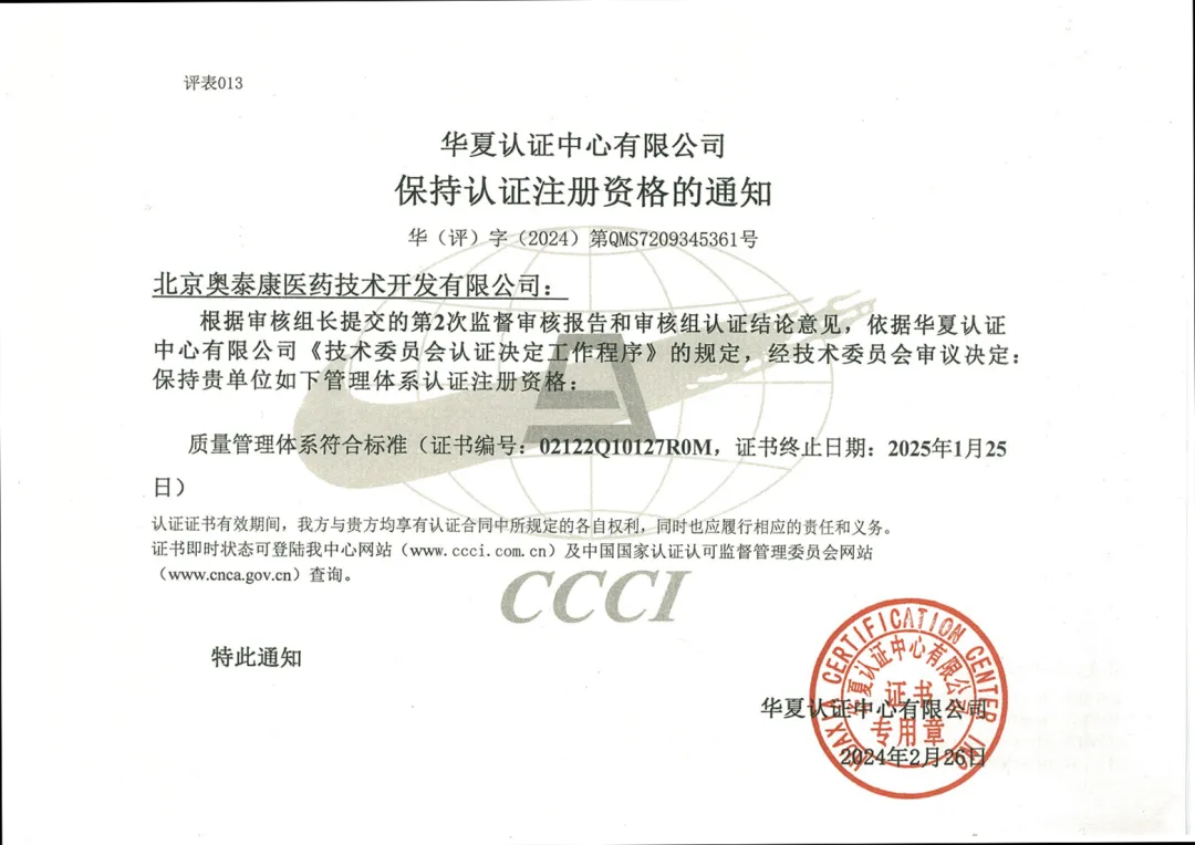 2024年3月,北京奧泰康醫(yī)藥技術(shù)開發(fā)有限公司經(jīng)華夏認(rèn)證中心有限公司(CCCI)認(rèn)證,順利通過ISO9001:2015 標(biāo)準(zhǔn)質(zhì)量管理體系認(rèn)證年度審核,認(rèn)證范圍為醫(yī)療器械臨床試驗(yàn)及產(chǎn)品注冊(cè)服務(wù)。嚴(yán)格的質(zhì)量管理體系是企業(yè)持續(xù)、穩(wěn)定、健康發(fā)展的根本保證,通過ISO9001認(rèn)證標(biāo)志著我司的醫(yī)療器械臨床試驗(yàn)及產(chǎn)品注冊(cè)服務(wù)與管理體系已達(dá)到了國(guó)際標(biāo)準(zhǔn)、行業(yè)標(biāo)準(zhǔn),在制度化、體系化和標(biāo)準(zhǔn)化方面取得了里程碑式的進(jìn)展。