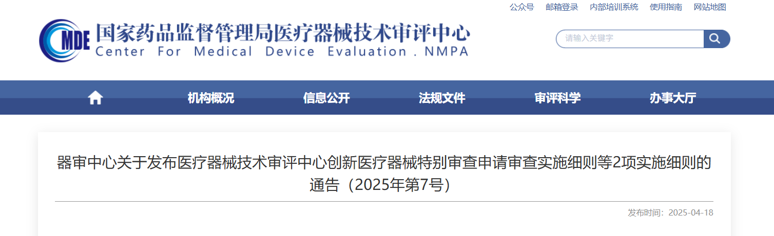 新政速遞,器審中心發(fā)布「創(chuàng)新醫(yī)療器械特別審查申請審查實施細則和醫(yī)療器械優(yōu)先審批申請審核實施細則」有關(guān)事項的通告為深入貫徹黨的二十屆三中全會精神,落實《國務(wù)院辦公廳關(guān)于全面深化藥品醫(yī)療器械監(jiān)管改革促進醫(yī)藥產(chǎn)業(yè)高質(zhì)量發(fā)展的意見》(國辦發(fā)〔2024〕53號)要求,進一步優(yōu)化創(chuàng)新審查和優(yōu)先審批工作,加強申請人和審查專家的溝通,強化對創(chuàng)新醫(yī)療器械和優(yōu)先審批醫(yī)療器械研發(fā)和注冊的技術(shù)指導(dǎo),引導(dǎo)申請人開展?jié)M足臨床需求的創(chuàng)新醫(yī)療器械設(shè)計開發(fā),根據(jù)《國家藥監(jiān)局關(guān)于發(fā)布創(chuàng)新醫(yī)療器械特別審查程序的公告》(2018年第83號)《食品藥品監(jiān)管總局關(guān)于發(fā)布醫(yī)療器械優(yōu)先審批程序的公告》(2016年第168號),器審中心制定了《醫(yī)療器械技術(shù)審評中心創(chuàng)新醫(yī)療器械特別審查申請審查實施細則》《醫(yī)療器械技術(shù)審評中心醫(yī)療器械優(yōu)先審批申請審核實施細則》,現(xiàn)予發(fā)布。