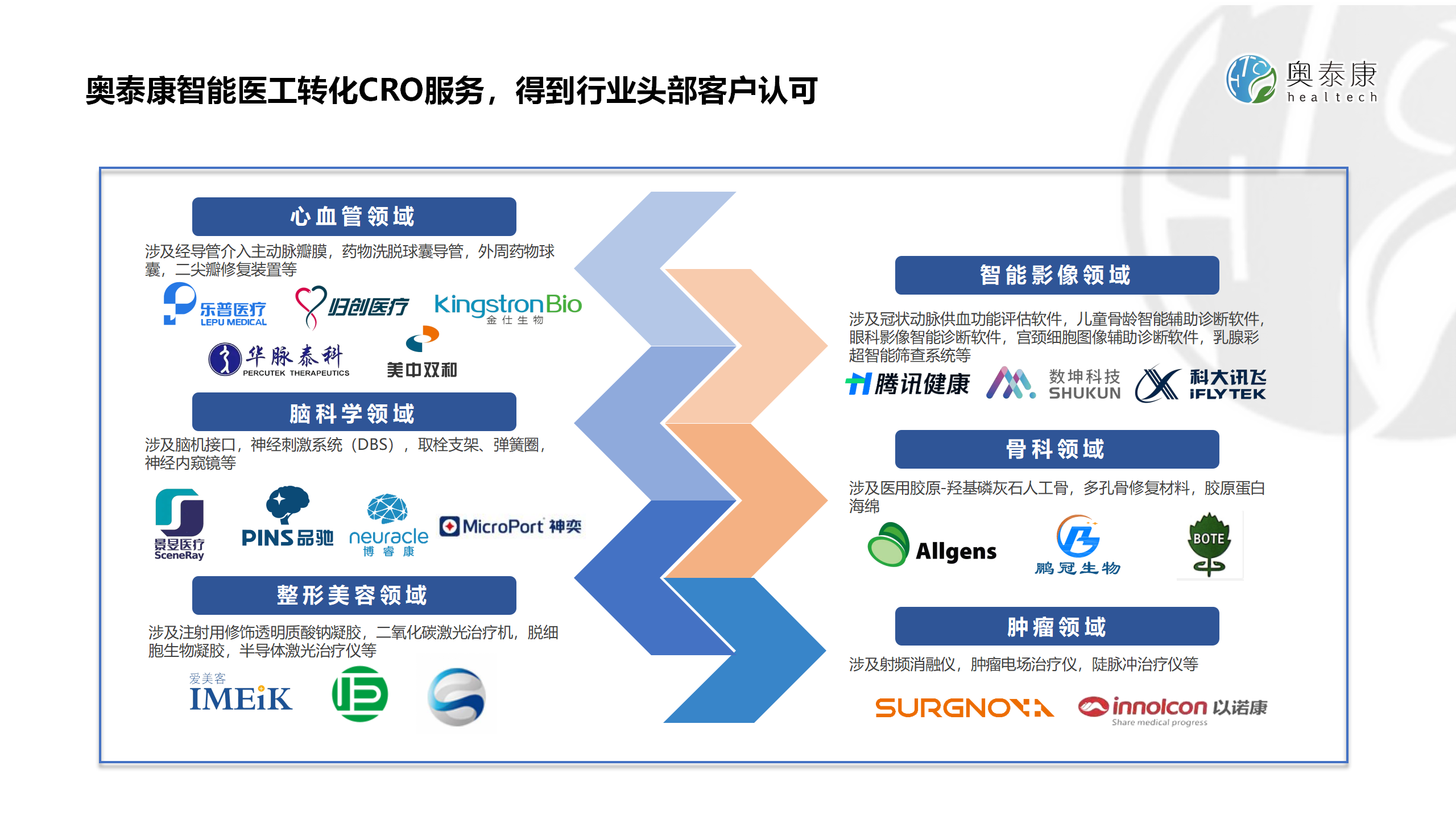 奧泰康始終以臨床需求為導(dǎo)向,依托CRO&CDMO一體化服務(wù),以服務(wù)技術(shù)創(chuàng)新為引領(lǐng),在以心腦血管、神經(jīng)介入、人工智能、醫(yī)美整形、骨科、腫瘤等為主的多個(gè)臨床應(yīng)用領(lǐng)域持續(xù)發(fā)軔,通過提供時(shí)效性強(qiáng)、成本可控、質(zhì)量有保障和專業(yè)性的全流程解決方案,持續(xù)推動(dòng)安全、有效和質(zhì)量可控的產(chǎn)品進(jìn)入市場,推動(dòng)臨床科技成果轉(zhuǎn)化落地。